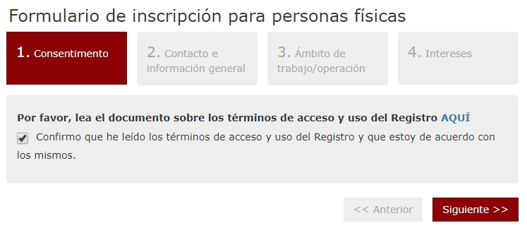 Luego de iniciar sesión, el usuario puede inscribirse como persona física, en cuyo caso deberá primero hacer click en “Consentimiento” para luego proceder con el ingreso de datos: